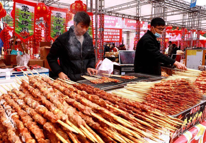 市集上一米长的烤羊肉串飘香四溢