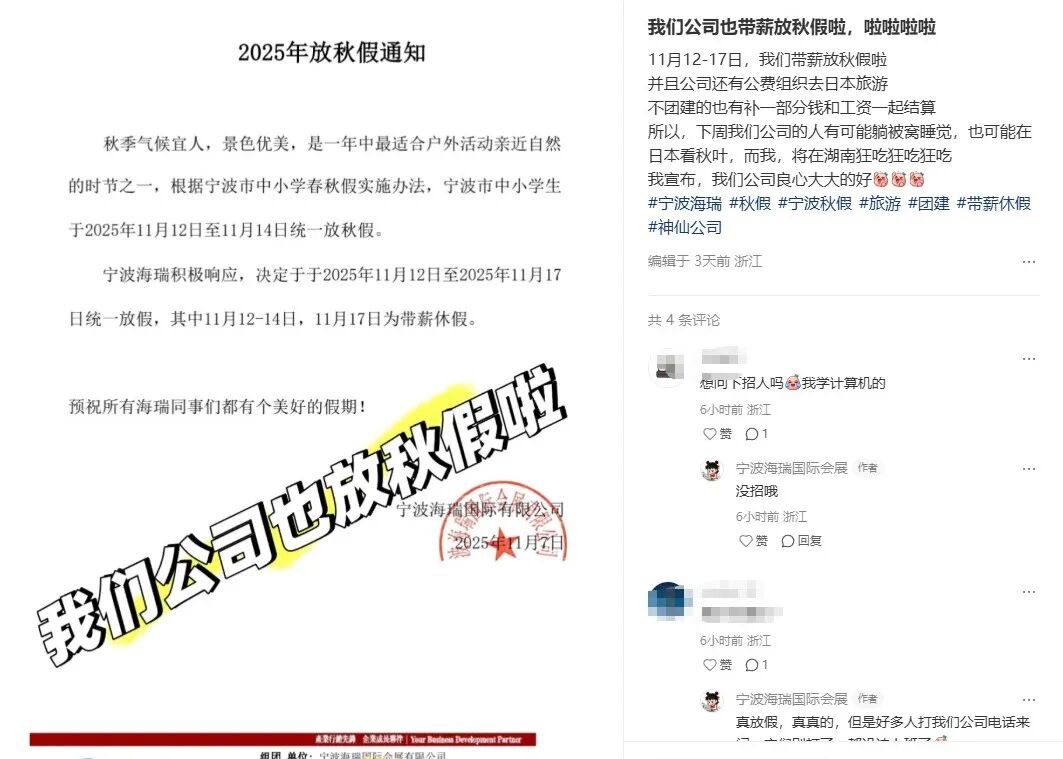 博主“宁波海瑞国际会展”称,为了配合宁波市中小学生的秋假安排,该公司积极响应,决定于“2025年11月12日至17日统一放假,其中11月17日为带薪休假”。帖子内容让不少家长表示“羡慕嫉妒”,博主表示该公司的电话都被“打爆”了。